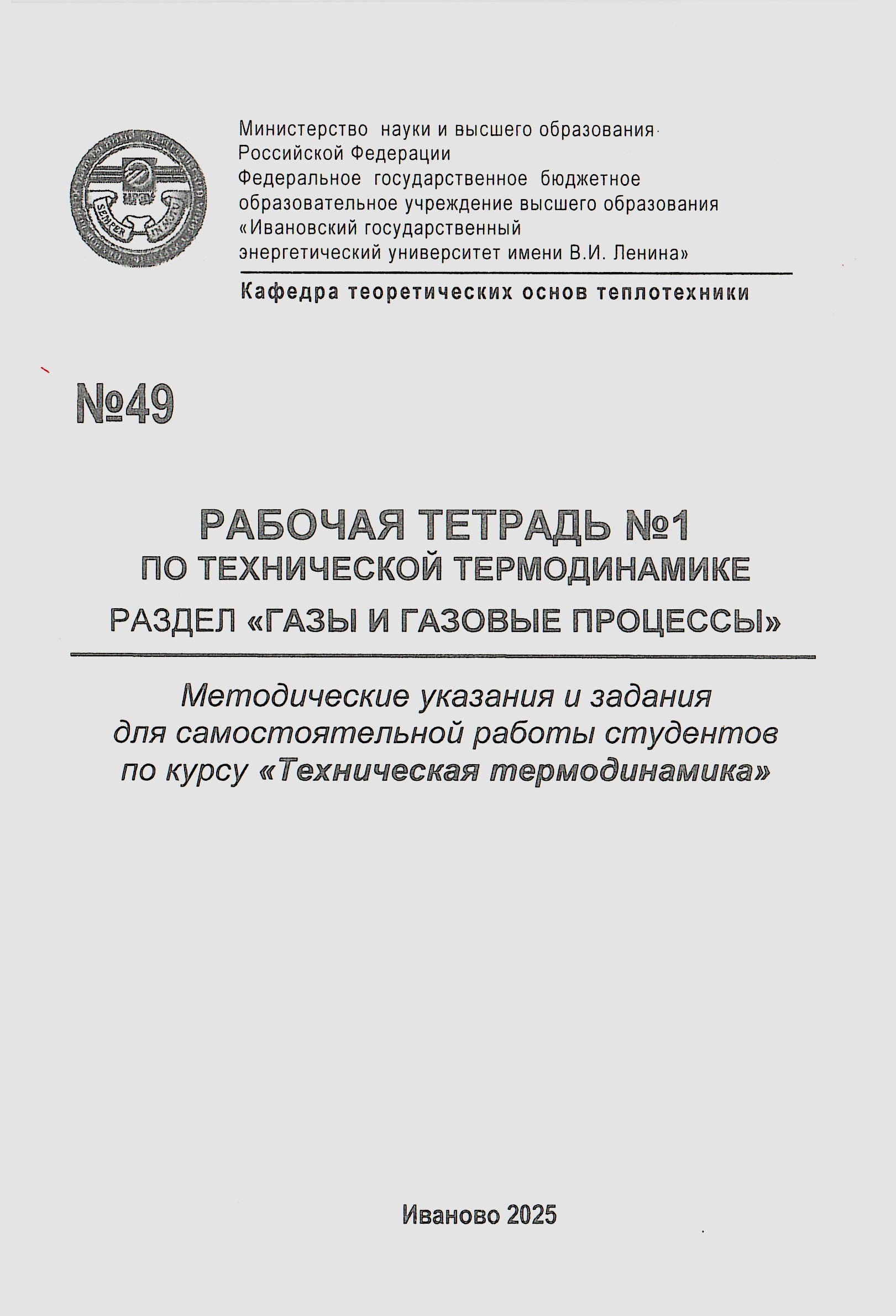 Чухин И. М. Рабочая тетрадь №1 по технической термодинамике раздел "Газы и газовые процессы" / И. М. Чухин, Д. В. Ракутина. - Иваново, 2025. - 52 с.